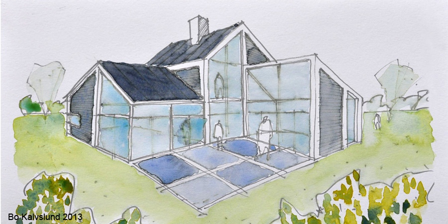 Eksempler på arkitekturillustrationer udført med håndtegnet udtryk og farvelagt med akvarel. Udtrykket kan godt være moderne selv om teknikken er traditionel. Idéer til byggeri udføres.